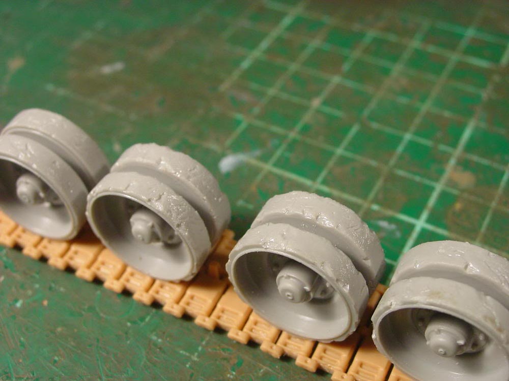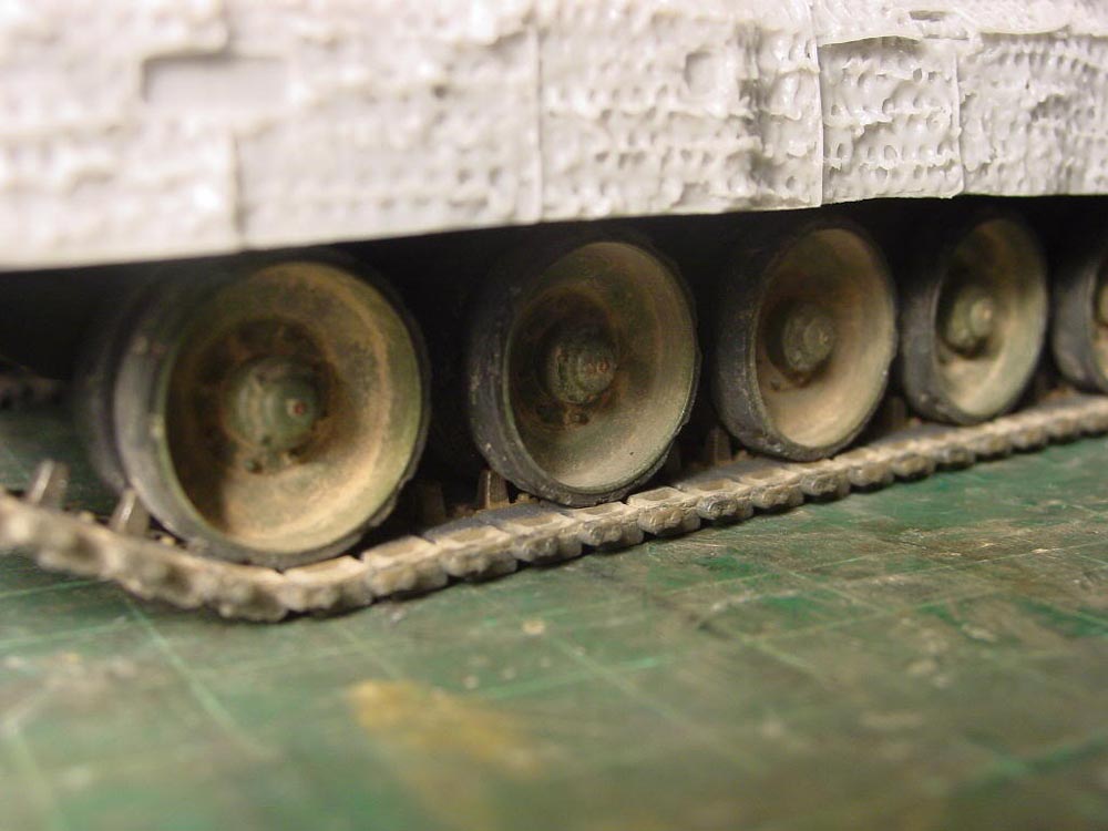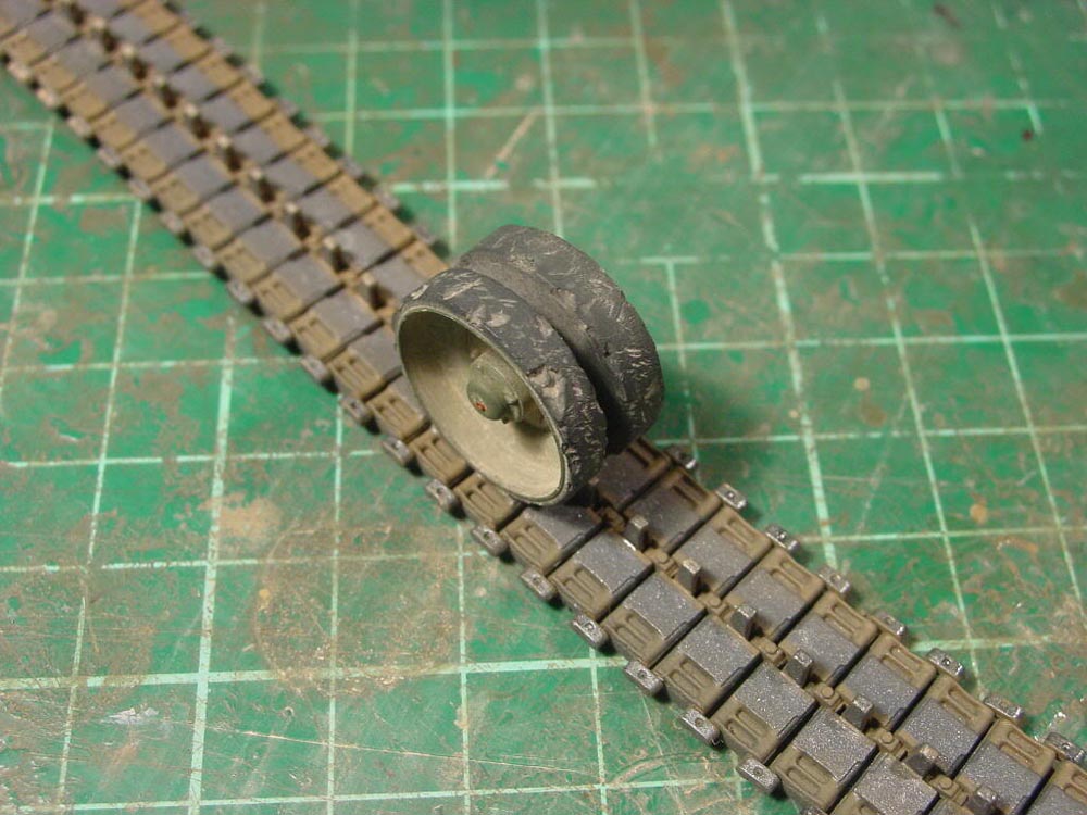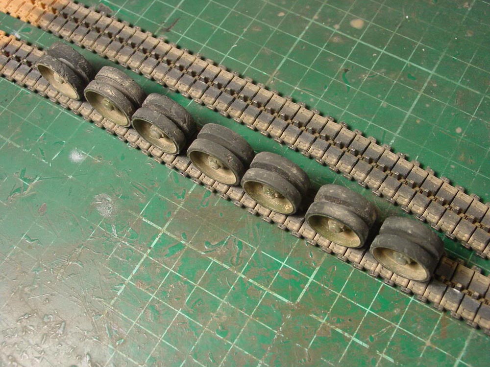 I used Bronco tracks and roughed them up with a drill. The road wheels were damaged with a sharp hobby knife.