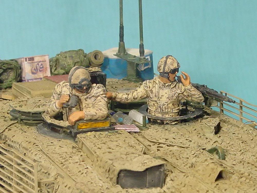 Beside minor additions, I scratch-built a new larger commander's PERI. Anti-slip coating was done with Pro Art Models metal powder and Tamiya acrylic paint as fixing agent. The camouflage is pure fantasy as is the crew with Live Resin heads with ACH/MICH helmets. I know that this is completely unrealistic but they simply look so cool - I had to do it ...