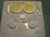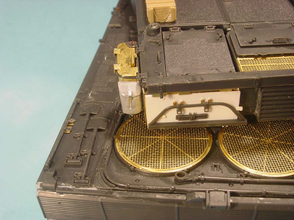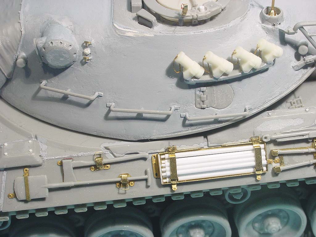 I used Voyager's Leo 2A5 PE set. The box for the refuelling funnel (the white thing in the middle) was scratched because Hobby Boss simply forgot it. The gun travel lock is a resin copy of the Tamiya part.