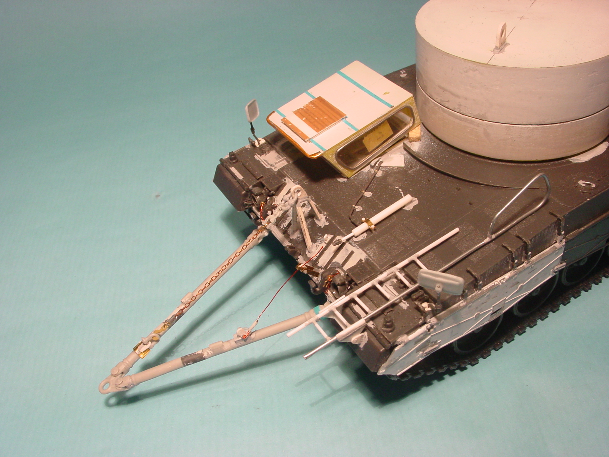 Main changes were the absence of all mudguards (front-side-rear), a large improvised storage bin made from Hescos at the rear of the superstructure, a big metal box on the rear with an aerial recon panel and on the crane the deep fording shaft and the camo net supports were removed making it necessary to drill a bunch of openings. I did this after taking the pre-paint stage pics because I wasn't sure how to get the openings right. In the end, I gave it a try and it went quite well.